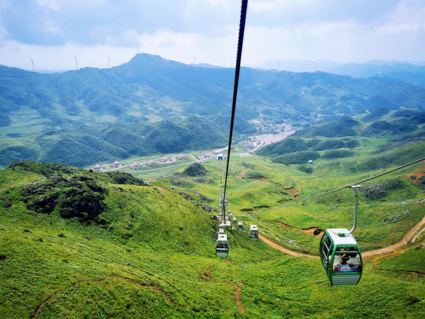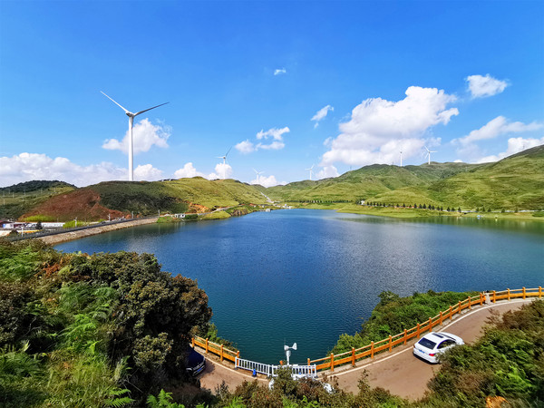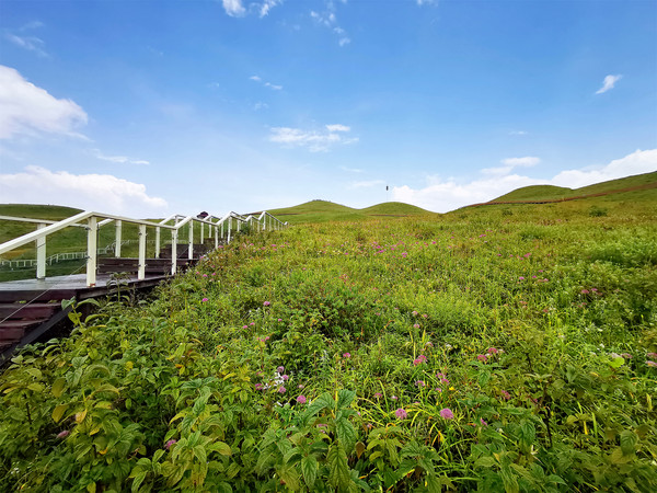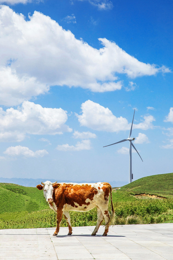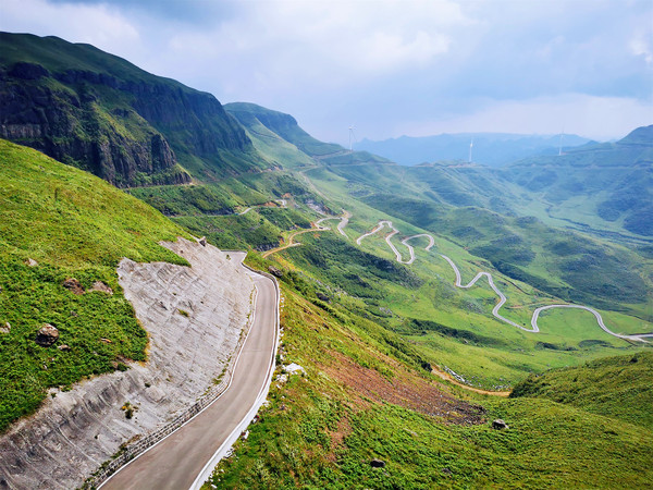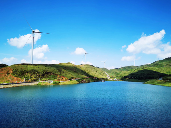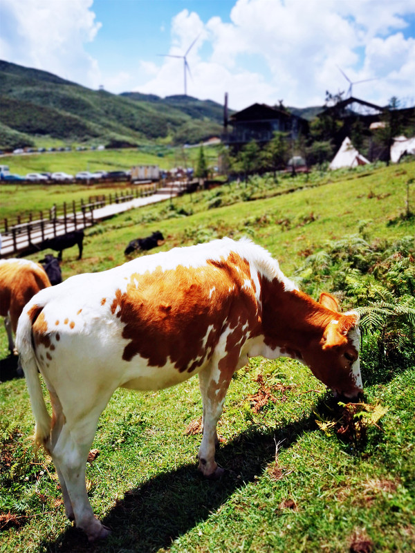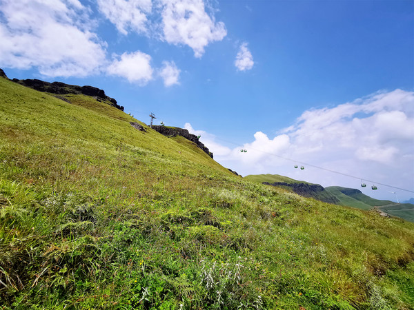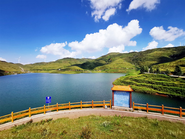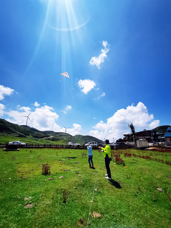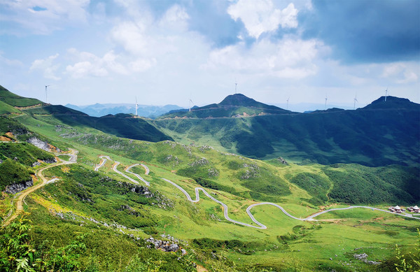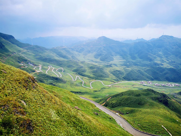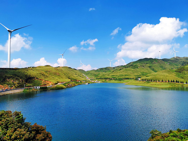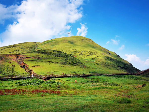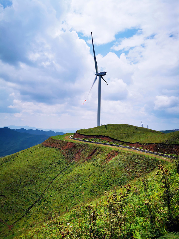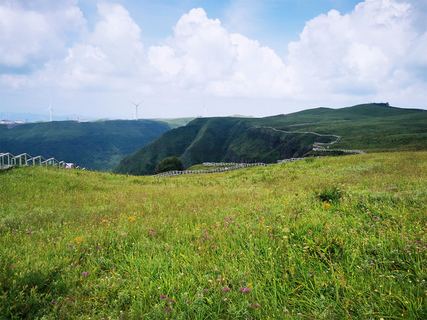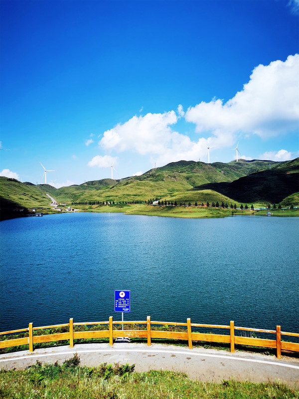 自驾前往乌蒙大草原,又称“坡上草原”,海拔在2000米以上,最高海拔为2857米,是贵州海拔最高、面积最大的天然高山草场,年平均气温11.1℃,气候凉爽怡人,是休闲避暑的好去处,即使在最热的七八月,在山上也能感受到丝丝清凉。不像北方草原那般“一马平川”,这里一望无际的高原草场,沿着山头的坡度向远方蔓延,直通云海,起伏度不大,但形状并不规则,远远望去延绵起伏,碧野万顷,绿意盎然,非常有层次感,极为壮阔。我们一路自驾随着盘山公路前行,起伏弯曲的公路就像长龙在山谷、坡头、草原盘旋飞舞,以曼妙的身姿划出一条条不规则的弧线,每一次的转弯,你都能看到不一样的风景,草原上随处可见散养的牛羊成群,它们经常“拖家带口”,休闲地在山坡头漫步,或是懒懒趴倒晒着太阳,间或低头享受着青草的美味,不时甩动着尾巴,一台台新安装的风电机组迎风起舞,风车飞转,它们是如画风光的灵动点缀,好像在欢迎着来自远方的宾客,近在咫尺的云朵,仿佛来自宫崎骏的漫画世界,天池碧波荡漾,清澈见底,是贵州海拔最高的湖泊,也是整个乌蒙大草原的点睛之笔,犹如瑶台坠落晶莹剔透的碧玉,优雅自然地镶嵌在这片绿毯上,天池是西南地区最为独特的高原湖泊,因彝族同胞历来就喜欢称有水的地方为“海子”,这里也被称为“长海子”。虽然已经过了野花怒放的季节,但漫山的绿依然养眼,微风习习,我们俯瞰绵延峻岭,仰望旋转风车,在草原上肆意奔跑,放着风筝,与牛羊嬉戏,大口呼吸着野草芬芳的新鲜空气,体验高山草原的惬意,用心感受只有19°C的夏天。