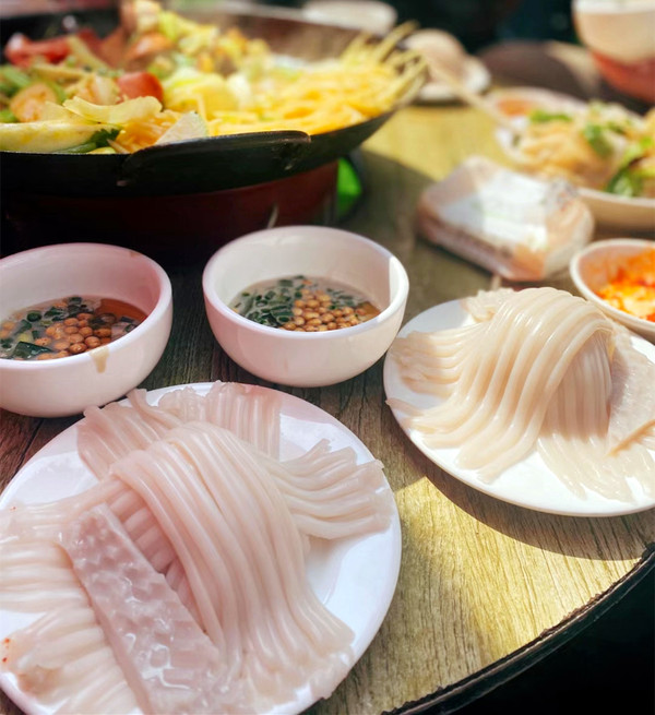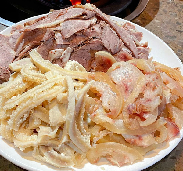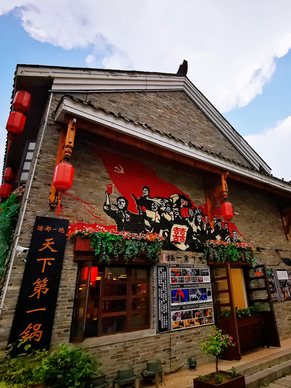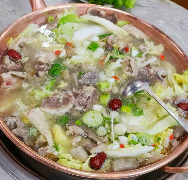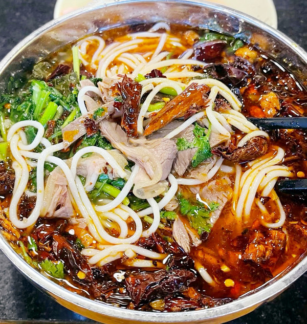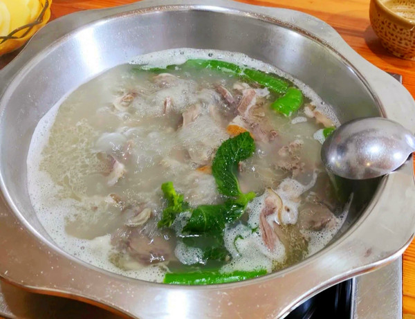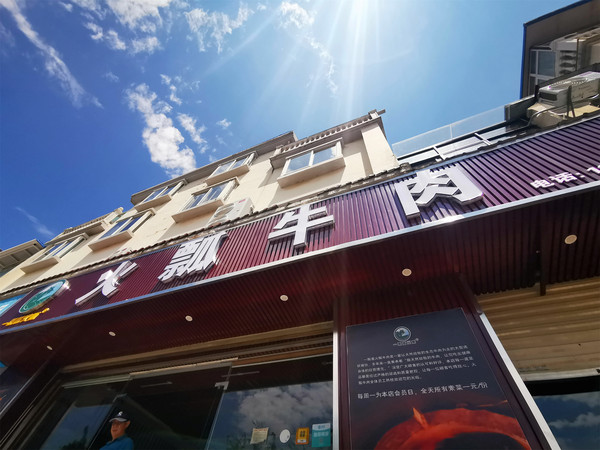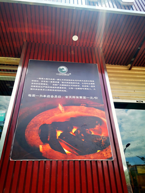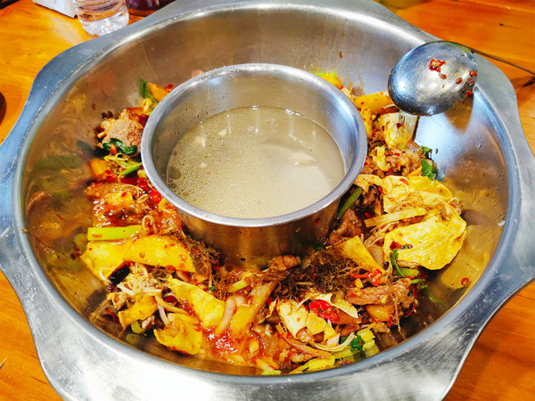 车停会泽赶上正午烈日当空,还没来得及去“钻钱眼”,就在公园附近发现了一家保山火瓢牛肉,想当年在腾冲第一次吃到后一直念念不忘,今天总要借此机会重温一下,索性先解馋后逛公园。火瓢牛肉火锅是云南的一种特色火锅,据说来源于茶马古道滇藏古老的马帮驮夫,早年烧的是梨炭,使用的是白族的铜瓢,煮的是纯正散养黄牛肉,多年来始终不变,仍然使用传统的环保炭火烹煮,将鲜牛肉、带皮熟牛肉、牛筋牛肚等倒入原味的高汤炖煮,散发出来的香味让人欲罢不能,口袋豆腐外皮有韧劲,煮熟后形似口袋,入口软嫩清香,再涮些豌豆尖、薄荷叶等野菜,热腾腾的苦荞粑粑边子酥酥的,像烤蛋糕,有苦荞特有的香气。
