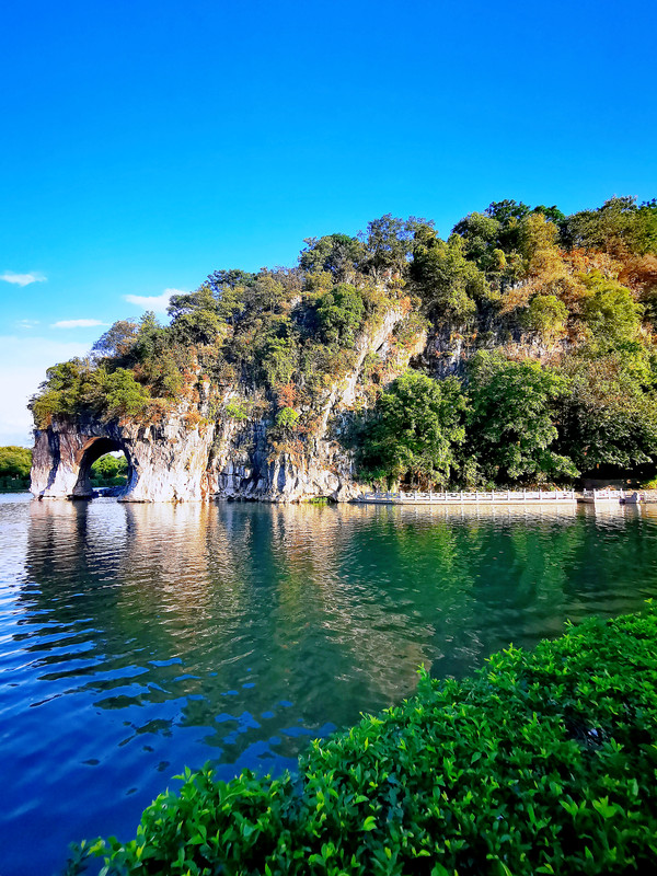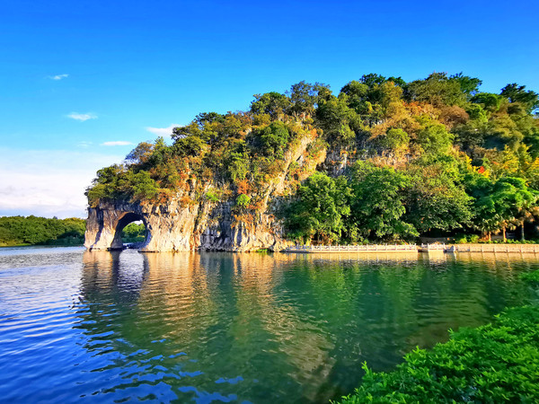 象鼻山原名漓山,主体景观因酷似一只站在江边伸鼻豪饮漓江甘泉的巨象而得名,1995年被评为桂林市城徽标志,是桂林山水的象征,象鼻山景区于2022年1月31日开始全面免费开放,只需要简单填报信息就可以进入,3号门进1号门出,2号门暂时没开放,景区内有很多大象的雕塑,拍拍照挺好看,对岸远远能看到桂林又一新地标——漓江歌剧院,晚上观赏象山也别有一番趣味,在灯光的映衬下,象鼻轮廓清晰,光彩照人,沿着江边散步不远处就是两江四湖的日月双塔,还可以到附近的正阳步行街尝尝桂林金奖啤酒鱼,早上去隔壁的唐家米粉来一碗正宗的卤粉。