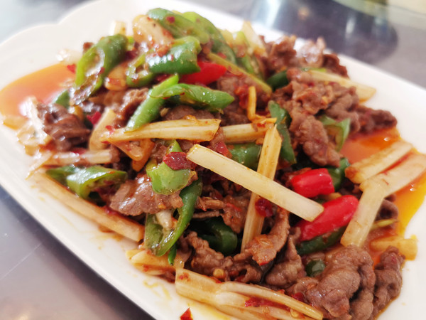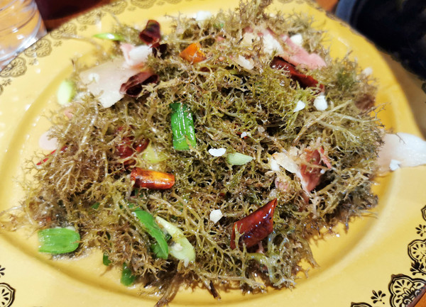 说到贵州美食,盘县牛肉必须有它的一席之地,更喜欢麻辣干锅的口味,在高汤之余,更讲究麻辣调味料,每家店都有自己的诀窍,那股独特的麻辣鲜香,很容易让人上瘾,牛掌柜就在乌蒙大草原景区内,就在网红的十方云舍民宿对面,玩累了就吃,选用新鲜的盘州上等黄牛肉,感觉就是把外面草地上溜达的牛牛直接打进来就地正法宰杀,再配上老板独家的做法,一锅香喷喷的干锅牛肉就上桌了,入口香味四溢,嫩而不柴,油而不腻,真的好吃到了心巴里,大锅吃干锅牛肉中间小锅清汤煮蔬菜,一锅两吃,再配个特色地胡子炒腊肉,地胡子又名树花菜,乌蒙大草原山顶纯天然绿色食品,口感嫩爽,煮、炒、凉拌都可以做成一道美味佳肴。