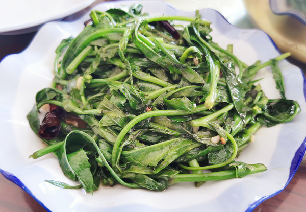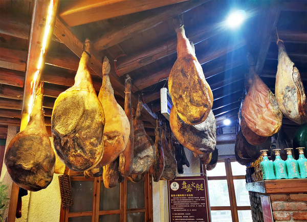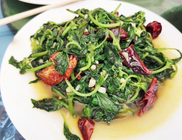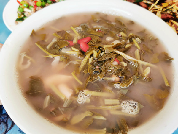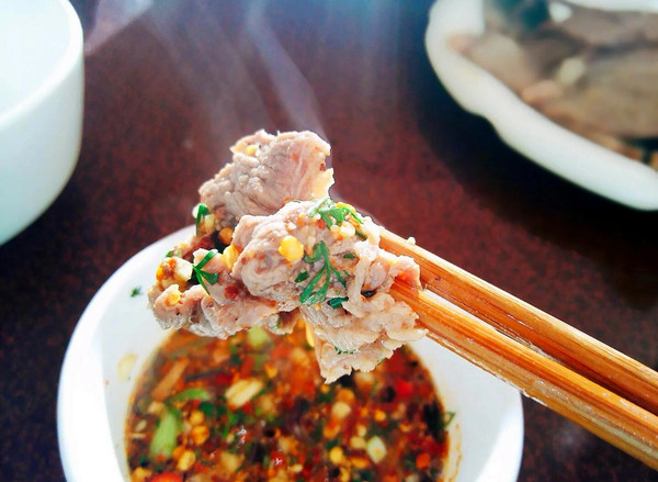 大夏天吃火锅还能不出汗?也就是在贵州了。六盘水的牛肉火锅、羊肉火锅都很出色,在当地吃火锅,离食材原产地近,牛肉、羊肉都现宰现吃,抢着在它最鲜美的时候大吃一顿,爱吃的人,即使专程来吃几顿火锅都很值。羊肉火锅也没别的诀窍,架不住人家黑山羊羊肉好,古镇入口处就有一家黔羊宴,一进门房梁上就挂着好多大火腿,当锅里咕噜呼噜的热气滚过一阵,一锅鲜美浓稠的羊汤就已经酝酿妥当了,吃之前记得先喝上一碗热乎乎的新鲜羊肉清汤,暖心又开胃,那浓稠的汤汁,软烂的羊肉,别提有多味美了,而且完全不膻,搭配的凉拌折耳根和松针非常爽口,特别是松针,就是用松树最嫩的芽儿尖做的一道菜,淡淡的野菜清香。
