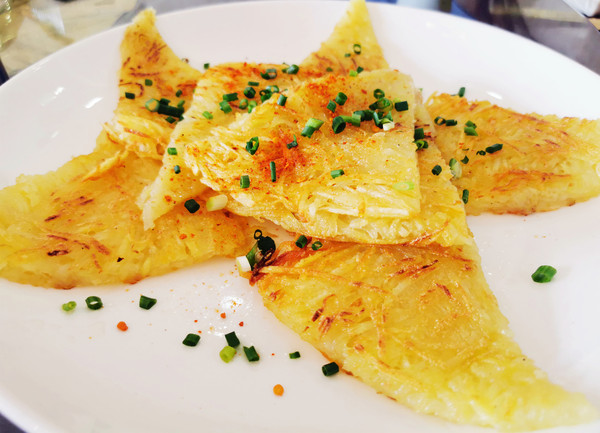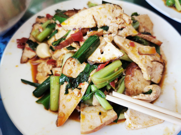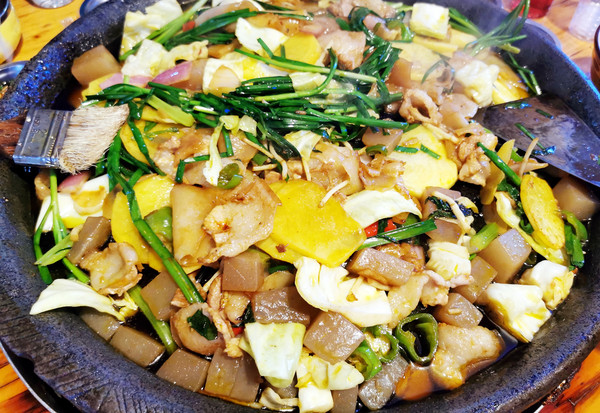 贵阳北站接上乘高铁抵达的同伴,我们终于到了织金,酒店我没选网红的织金饭店,而是选了县里老城区的黔东酒店,周围环境看起来不咋滴,酒店内部却还不错,周围走路去哪里都很近,织金的烙锅店很多,来织金旅游一趟,不吃上一顿烙锅,都不算来过织金,我们跟着酒店老板的推荐,寻到了本地食客钟意的唐记土络锅,周边环境实在不敢恭维,这应该就是名副其实的苍蝇馆子,一张小方桌再加一只火热的铁锅,边烙边吃,这才是烙锅的魅力,“一切皆可烙”的烙锅—豆腐、洋芋片、五花肉、蔬菜菇类……烙到两面金黄,配上特制的辣椒面和蘸水,三五好友,在这张烙锅桌前慢慢享受美味,口水跟着油一起冒泡,听红红绿绿的食材滋滋作响,那叫一个脆香味浓,加点啤酒,一顿可以吃好久。
