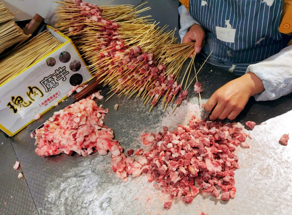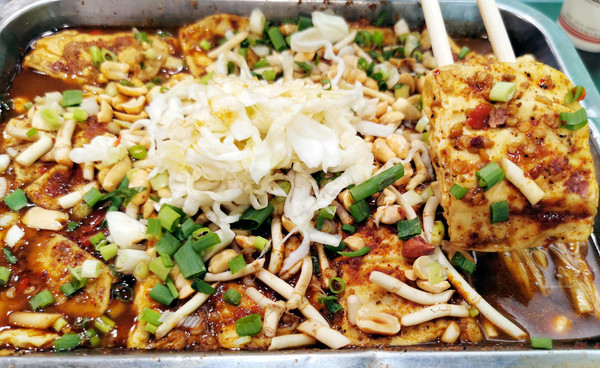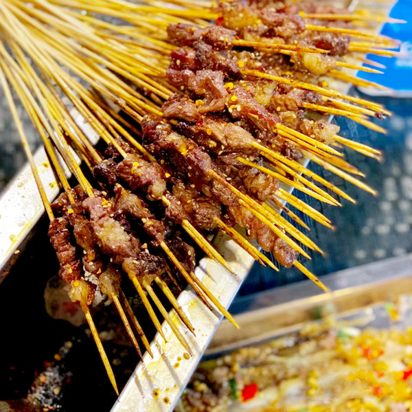 下午抵达昭通,我们住在昭通古城附近的维也纳酒店,紧挨市政府,在昭通有大大小小规模不等的烧烤城,这里的烧烤尤其诱人,还上过《人生一串》,夜晚吃小肉串已经成为一种当地人和游客来到昭通的生活方式,再配上云南啤酒,大排档的夜生活很接地气。我们散步到附近的远大美食城,选了热闹的甘马亚烧烤,这里最招牌要属昭通小肉串,当地人叫做“把把烧”,可谓云南烧烤界的扛把子,小串按把烤制,单点不卖,选用的肉都是生长在海拔1900米以上小黄牛中的上里脊肉,这种小肉串吃起来不仅口感饱满,稚嫩细滑,而且唇齿留香,每一串小肉串都要刷一层秘制酱料,腌渍几分钟,烤串师傅不停在碳火上翻滚,将肉与酱料的香气尽数激发,锁住最鲜的味道,起炉前撒上满满的黄辣子面和白芝麻,泛光的牛膘一口咬下去鲜嫩入味,柔香弹牙,瞬间满足感爆棚!包浆豆腐也很好吃,软嫩可口,折耳根、泡菜、葱花、各种调料,融合一起,吃进嘴里口感像脑花一样。