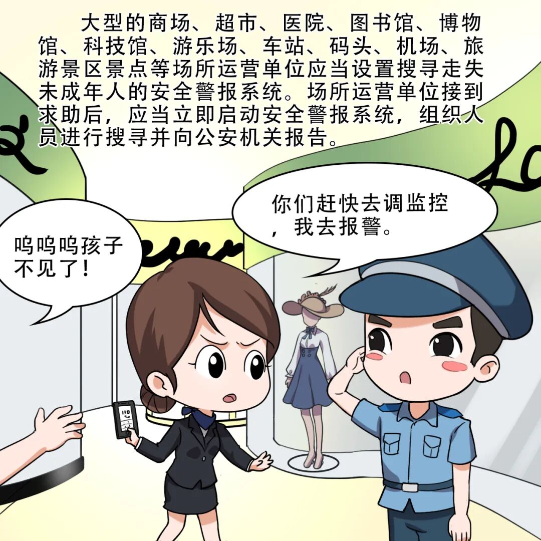 大型的商场、超市、医院、图书馆、博物馆、科技馆、游乐场、车站、码头、机场、旅游景区景点等场所运营单位应当设置搜寻走失未成年人的安全警报系统。场所运营单位接到求助后,应当立即启动安全警报系统,组织人员进行搜寻并向公安机关报告。