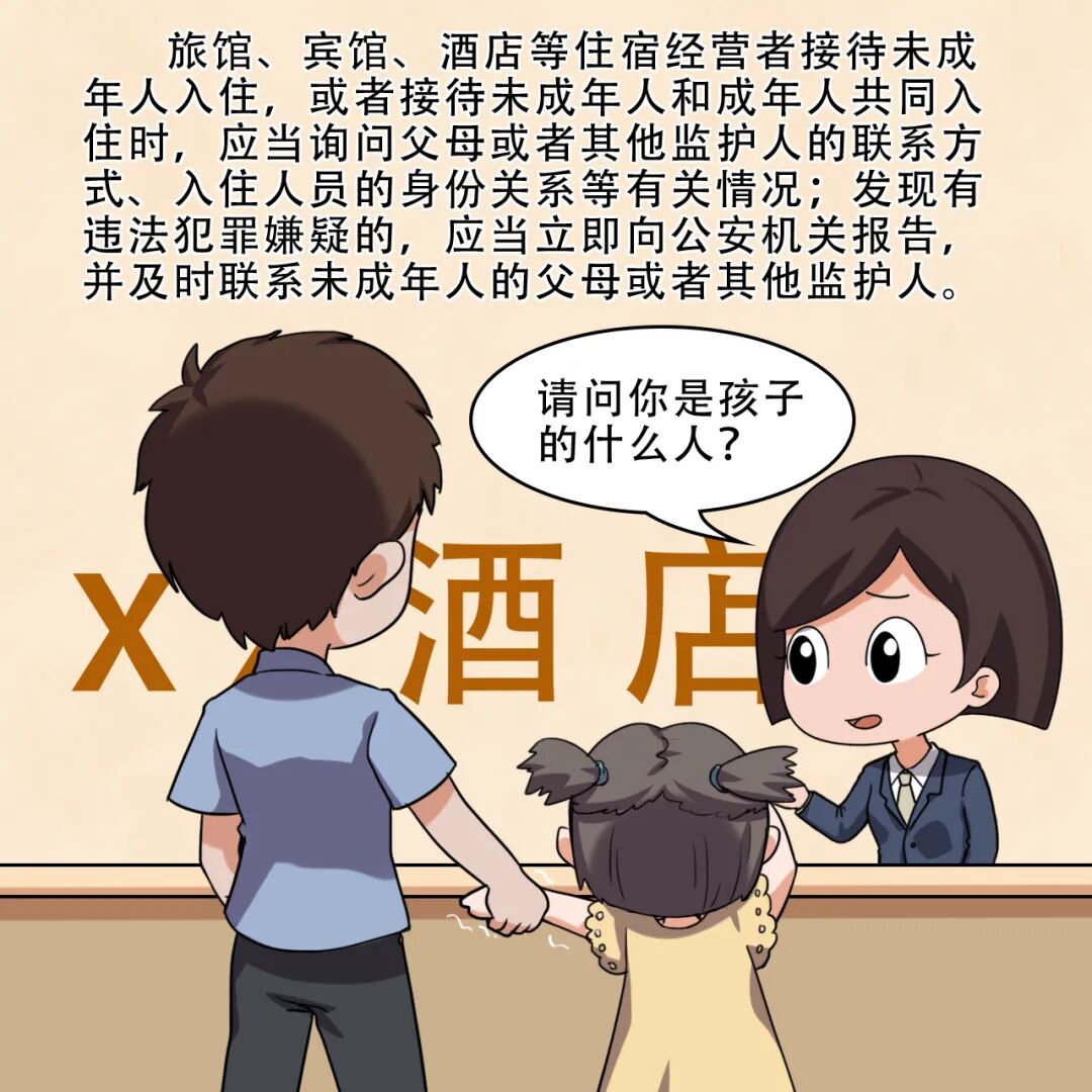 第五十七条旅馆、宾馆、酒店等住宿经营者接待未成年人入住,或者接待未成年人和成年人共同入住时,应当询问父母或者其他监护人的联系方式、入住人员的身份关系等有关情况;发现有违法犯罪嫌疑的,应当立即向公安机关报告,并及时联系未成年人的父母或者其他监护人。