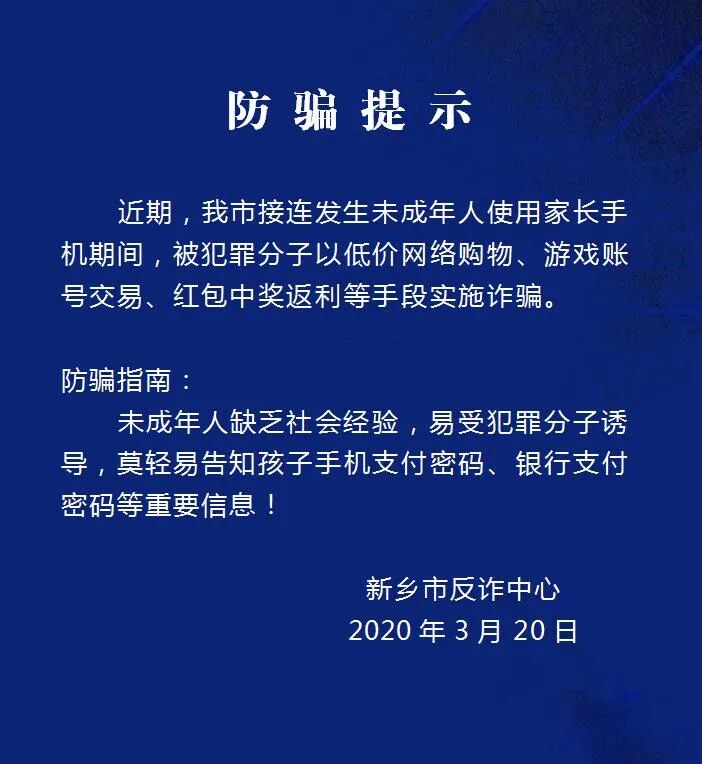 日前,新乡市反诈中心发布防骗提示,近期新乡市接连发生未成年人使用家长手机期间,被犯罪分子以低价网络购物、游戏账号交易、红包中奖返利等手段实施诈骗。新乡市反诈中心提示,家长莫轻易告知孩子手机支付密码、银行支付密码等重要信息。
