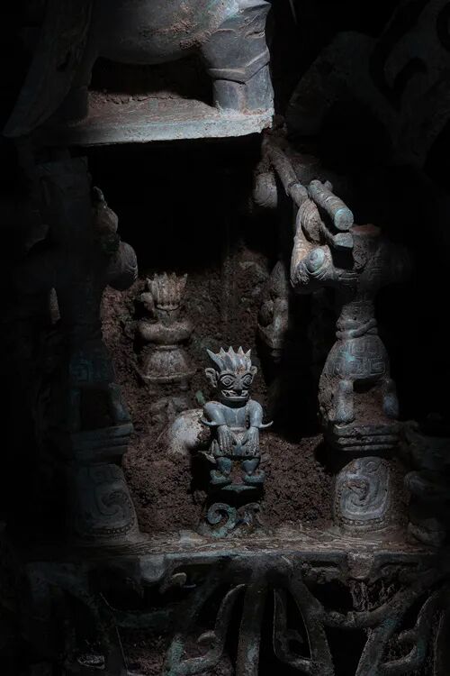 基座平面上,一出好戏正在上演,负责8号“祭祀坑”现场考古工作的北京大学考古文博学院副教授赵昊认为,这件青铜神坛“描绘了一个祭祀场景,代表着三星堆人对世界的理解”。基座平面上共铸有13个青铜人像,四角各有一跪坐的人,四位高大的“力士”因为跪坐在一个小台基上更显威武,他们面向前方,合力抬起一只小神兽,小神兽是各种动物的混合体,造型十分独特,高大的“力士”之间是四位端坐在小台基上的人,而位于整个基座平面中心的是一个跪坐的小铜人,许多网友说它与今天青年人喜欢的手办如出一辙,可见三星堆人在审美上走在了时代前列。