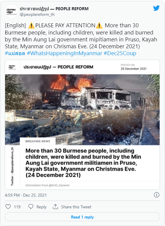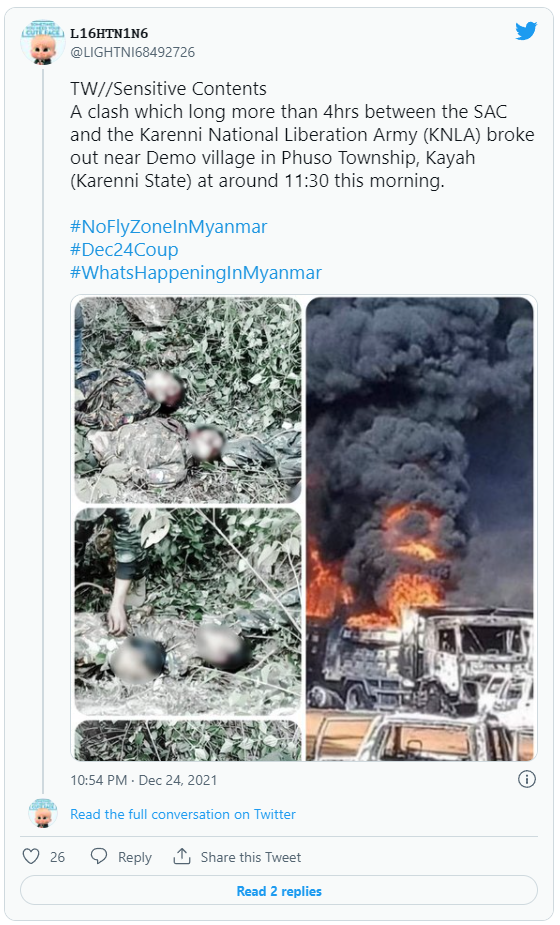 时隔不久,平安夜大屠杀又上演,根据路透社,缅甸东部克耶邦25日发生大屠杀。