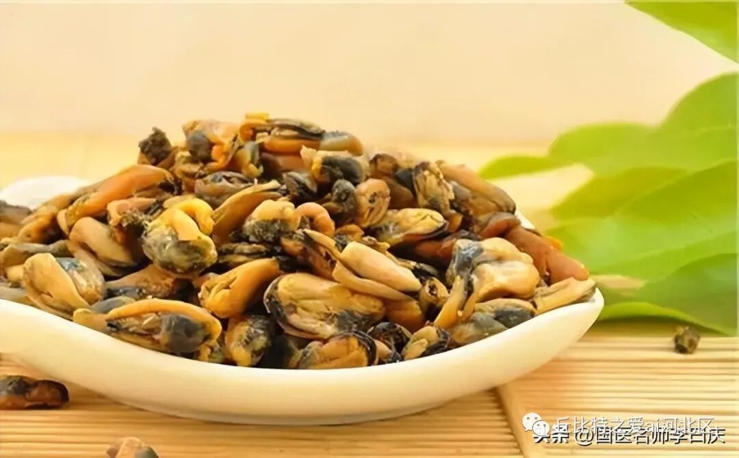 淡菜--淡菜又名珠菜、壳菜。含厚实蛋白质、碘、B族维生素、锌、铁、钙、磷等。其味咸,性温,有温肾固精、益气补虚功用。