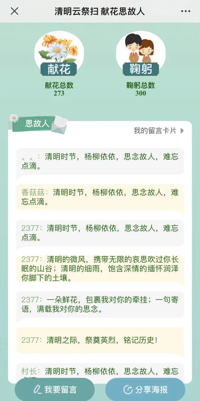 参与“献花”“鞠躬”以及留言之后,可以将分享海报到朋友圈。