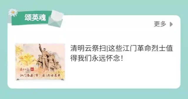 为缅怀先烈、追思故人,江门市文明办、江门市教育局、江门市民政局和江门市退役军人事务局联合南方报业传媒集团江门分社在清明节期间(4月2日-4月10日)开展“清明云祭扫 献花思故人”网络签名寄语活动,鼓励市民通过云祭扫缅怀故人,悼念英烈,寄托哀思。 该平台于4月2日正式上线,市民可通过江门“云祭祀”平台,为先人烈士献花、鞠躬、留言,寄托哀思。 江门“云祭祀”平台的搭建,意在鼓励市民通过网络寄语,追思故人,缅怀逝者,以此避免清明期间祭扫人群扎堆,严防疫病传播、疫情反弹。云祭扫方式如下 戳文章末尾“阅读原文”进入江门“云祭祀”平台,为先人烈士鞠躬献花▼平台功能内容如下 内容一:在祭祀页面中可通过“献花”“鞠躬”以及留言,寄托哀思。