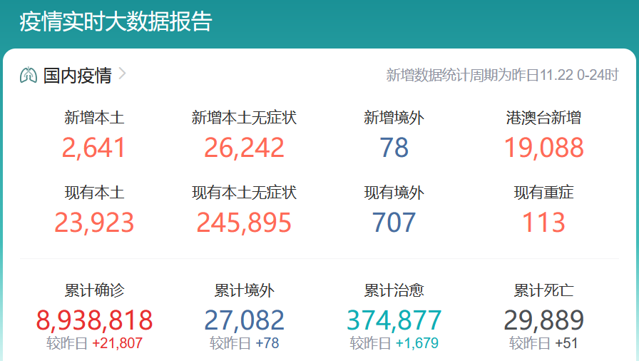 截至11月22日24时,据31个省(自治区、直辖市)和新疆生产建设兵团报告,现有确诊病例24630例(其中重症病例113例),累计治愈出院病例263645例,累计死亡病例5231例,累计报告确诊病例293506例,无现有疑似病例。累计追踪到密切接触者10669044人,尚在医学观察的密切接触者1313526人。