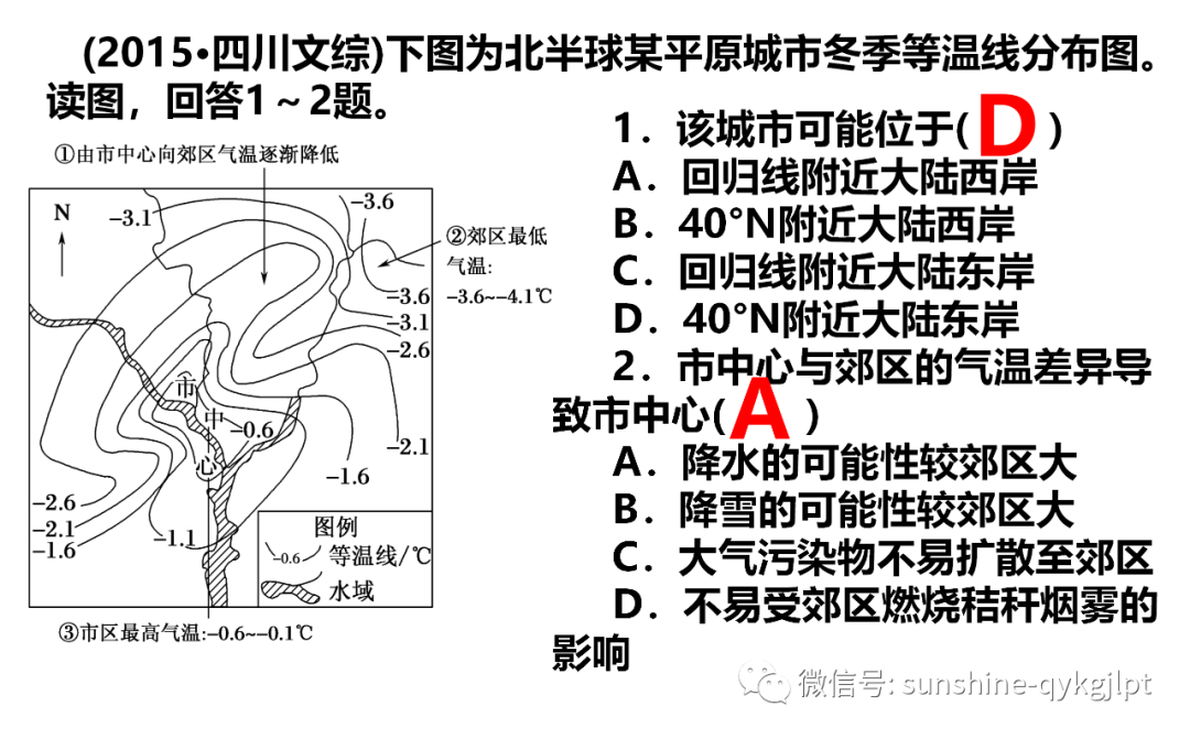 6.该城市可能位于A.回归线附近大陆西岸 B.40°N附近大陆西岸C.回归线附近大陆东岸 D.40°N附近大陆东岸7.市中心与郊区的气温差异导致市中心A.降水的可能性较郊区大 B.降雪的可能性较郊区大C.大气污染物不易扩散至郊区 D.不易受郊区燃烧秸秆烟雾的影响【答案】6.D 7.A【分析】6.读图,城市冬季等温线在0°以下,说明位于温带地区。回归线附近大陆西岸是热带或亚热带气候类型,最冷月气温大于0°C,A错。40°N附近大陆西岸是地中海气候或温带海洋性气候,最冷月气温大于0°C,B错。回归线附近大陆东岸受暖流影响,气温大于0°C,C错。40°N附近大陆东岸是温带季风气候区,最冷月小于0°C,D对。7.市中心与郊区的气温差异导致市中心热岛效应强,降水的可能性较郊区大,A对。结合前面分析,城市纬度较低,降雪的可能性小,B错。通过城市环流,大气污染物容易扩散至郊区,C错。近地面风由郊区吹向城市,中心区易受郊区燃烧秸秆烟雾的影响,D错。