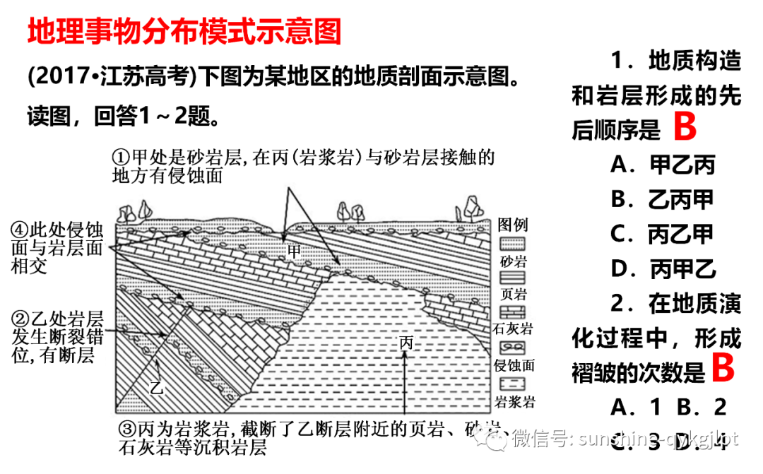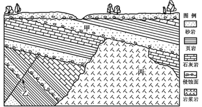 16.岩层形成的先后顺序是A.甲-乙-丙 B.乙-丙-甲 C.丙-乙-甲 D.丙-甲-乙17.在地质演化过程中,形成褶皱的次数是A.1 B.2 C.3 D.418.第一次褶皱形成于A.断层乙形成之前 B.岩层甲形成之后 C.断层乙形成之后 D.岩层丙形成之后【答案】16.B17.B 18.A【解析】16.沉积岩层下面的沉积早,乙处岩层有明显位移,图示地质构造中,乙断层形成最早。断层形成后,受外力侵蚀,形成侵蚀面,再有沉积层形成,然后岩浆侵入,形成丙岩层。此后又受外力侵蚀,形成侵蚀面,再有新的沉积层甲形成。地质构造和岩层形成的先后顺序是乙丙甲,B对。A、C、D错。故选B。17.沉积岩层在形成时是水平岩层,图示在地质演化过程中,乙断层形成前,岩层倾斜,说明有褶皱形成。甲岩层上面相邻岩层也是倾斜的,说明甲岩层及其上面沉积岩层形成后,又受挤压,形成褶皱。图示形成褶皱次数是2次,B对。A、C、D错。故选B。18.据上题分析可知:岩层形成的先后顺序是乙-丙-甲,乙断层形成前,岩层倾斜,说明乙断层破坏了已经发生褶皱的、倾斜的岩层,因此第一次褶皱形成于断层乙形成之前,A正确;BCD错误。故选A。【点睛】沉积岩层下面的沉积早,乙处岩层有明显位移,其上岩层没有位移,乙断层位于下面,形成最早。丙岩层上面有侵蚀面,说明丙形成后,被侵蚀,才有甲形成。沉积岩层在形成时是水平岩层,岩层倾斜,说明有褶皱形成。