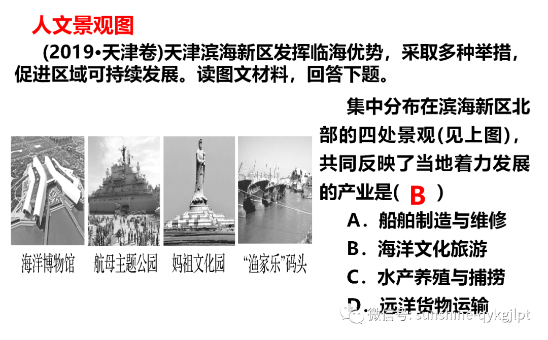 24.集中分布在滨海新区北部的四处景观(见上图1),共同反映了当地着力发展的产业是( )A.船舶制造与维修 B.海洋文化旅游C.水产养殖与捕捞 D.远洋货物运输25.政府有关部门在沿海滩涂上放置人工礁石,引种盐生植物(见上图2),其目的主要是( )A.保护海岸,净化海水B.恢复生态,美化环境C.增加湿地,吸引鸟类D.开发滩涂,海水养殖【答案】24.B25.A【解析】24.从材料中得知,滨海新区北部的四处景观海洋博物馆、航母主题公园、妈祖文化园和“渔家乐”码头都是立于临海优势,打造的人文旅游资源,以吸引旅客的文化服务产业,共同反映了当地着力发展的产业是海洋文化旅游。船舶制造与维修作为工业,水产养殖与捕捞作为农业,远洋货物运输作为运输业,在图中并无直接共同体现,排除A、C、D。故本题选择B。25.从材料中得知,人工礁石和盐生植物位置位于防潮堤前的高潮线和低潮线之间,人工礁石的放置可以削弱海潮对海岸的冲刷侵蚀,盐生植物的生长能消耗营养盐,净化水体,改善水质,A对;题干中也没有阐述沿海滩涂之前的生态环境如何,恢复生态用词牵强,B错;在沿海滩涂上放置人工礁石,引种盐生植物并没有直接增加湿地面积,C错;政府有关部门在沿海滩涂上放置人工礁石,引种盐生植物,是一种保护滩涂的方式,并非开发滩涂,D错。故本题选择A。