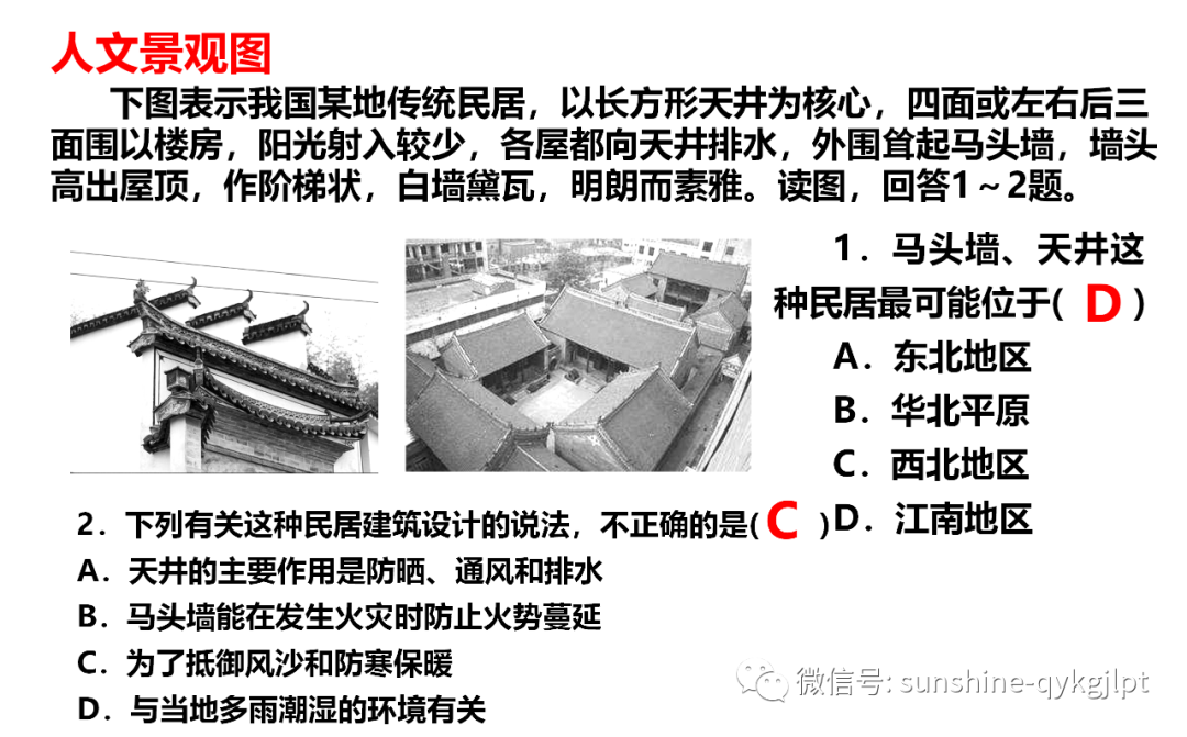 26.马头墙、天井这种民居最可能位于( )A.东北地区 B.华北平原 C.西北地区 D.江南地区27.下列有关这种民居建筑设计的说法,不正确的是( )A.天井的主要作用是防晒通风和排水B.马头墙能在发生火灾时防止火势蔓延C.为了抵御风沙和防寒保暖D.与当地多雨潮湿的环境有关【答案】26.D27.C【解析】26.本题考查自然环境对聚落的影响。据题干材料信息可知,马头墙为我国南方传统民居的风格,天井结构可避免过多的阳光照射,以降低院内气温,因此两种民居均为南方亚热带地区。故D项正确。27.本题考查中国区域环境特征及对聚落的影响。据上题分析,南方地区冬季温和,没有风沙天气,其民居不需要抵御风沙和防寒保暖问题。故C项符合题意。