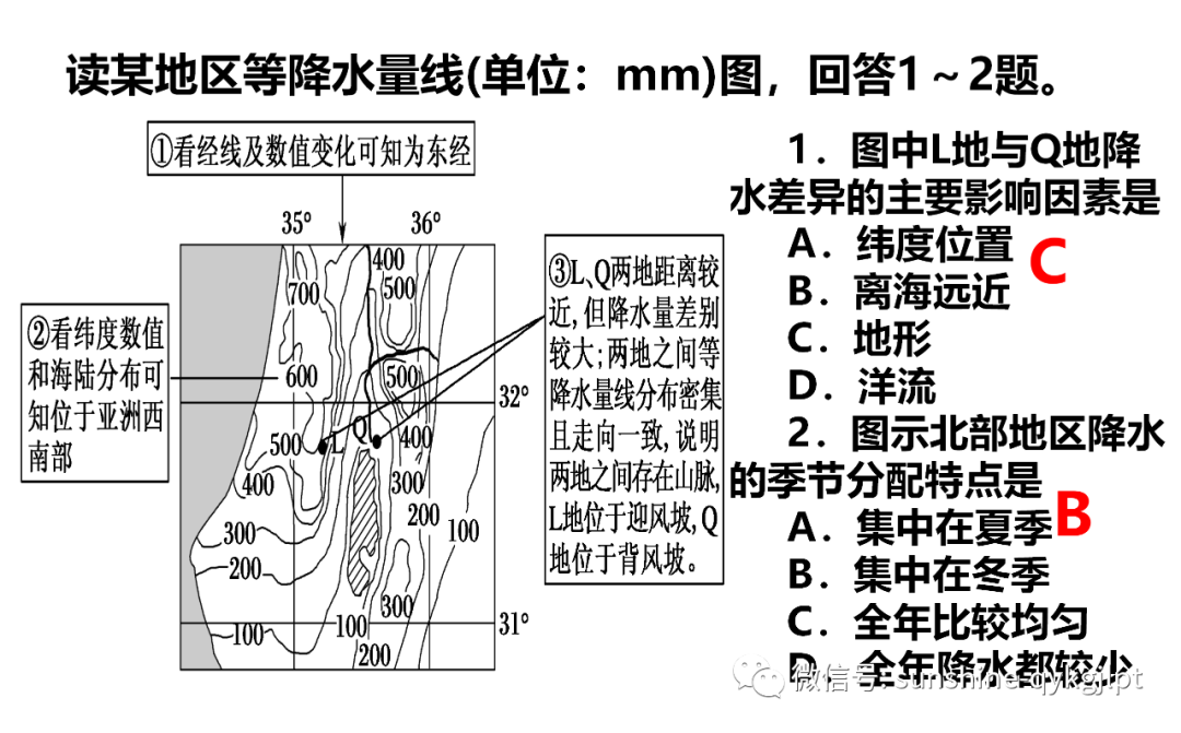 8.导致图中L地与Q处降水量差异的主要原因可能是A.纬度位置 B.海陆位置 C.地形 D.植被9.下列说法正确的是A.M海区属于印度洋 B.Q湖是世界上最深的湖泊C.该区域为热带草原景观 D.油橄榄是该区域主要农作物之一【答案】8.C9.D【解析】8.图中显示,该地位于30°N以北的大陆西岸地区,应受副热带高气压带和西风带交替控制,给当地带来降水的主要是盛行西风,根据图中等高线分布可知,L地位于西风迎风坡,水汽丰富,地形抬升,降水较多;而Q位于深谷中,处于西风背风坡,气流以下沉为主,不易成云致雨,降水稀少,由此判断,导致两地降水量差异的主要原因是地形,选项C符合题意。两地纬度位置差异不大,排除A。两地离海洋都较近,不是导致两地降水量差异的主要原因,排除B。L地植被可能比Q地覆盖率高,但Q为湿地,水汽条件也较好,因此植被是不导致两地降水量差异的原因,排除D。故选C。9.根据图示经纬度位置及海陆轮廓判断,该地为巴勒斯坦地区,M为地中海,Q湖为死海。地中海通过直布罗陀海峡与大西洋相通,属于大西洋,A错误。根据所学知识可知,死海是世界上陆地最低点,但不是最深的湖泊,世界最深的湖泊为贝加尔湖,B错误。该区域气候以热带沙漠气候和地中海气候为主,形成的植被以热带荒漠和亚热带常绿硬叶林为主,C错误。油橄榄是地中海气候区的典型园艺作物之一,该区域西临地中海,属地中海气候,适合油橄榄种植,D正确。故选D。