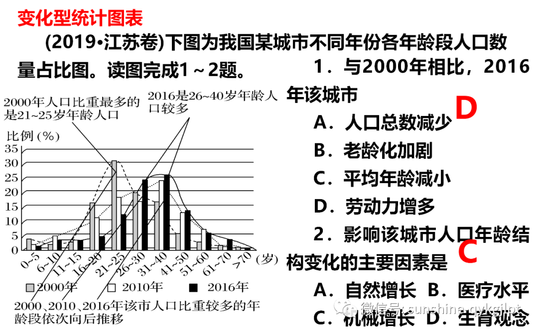 10.与2000年相比,2016年该城市( )A.人口总数减少 B.老龄化加剧C.平均年龄减小 D.劳动力增多11.影响该城市人口年龄结构变化的主要因素是( )A.自然增长 B.医疗水平C.机械增长 D.生育观念【答案】10.D11.C【分析】考查人口年龄结构的变化。考查学生利用所学知识判断、分析和解决问题的能力。难度一般。10.该图表示的是不同年龄段人口数量的占比而非人口的数量,因此无法判断人口总数的增加或减少A错误。人口老龄化指的是60岁以上人口大于10%, 65岁以上人口大于7% 2016年相对于2000年虽有所上升,但是明显没有超过5%,因此B错误。与2000年相比,2016年,该城市相对来说低于25岁人口占比下降,而26至50岁人口占比增加,因此整体来说平均年龄成增大趋势,而非减小趋势。C错误。劳动年龄人口,是指16到64岁具有劳动能力的人口,从图中可以看出劳动年龄人口比重相对增多,D正确。11.有第一题可知,2016年相对于2000年人口占比增加最大的主要是26至50岁的劳动年龄人口,也就是青壮年,由此可以推测,该城市就业条件好,吸引青壮年前来务工,引起了人口迁移,该城市低于25岁人口占比下降,有可能是教育因素影响,外出上学引起人口比重下降,因此影响该城市人口年龄结构变化的主要因素是机械增长。而不是自然增长,正确答案选C。医疗水平改善会延长人的寿命,因此年龄结构变化的主要为中老年人应当增多,与题意不符。生育观念以及人口的自然增长,主要影响人口数量的变化尤其是青少年比重的变化,而图中变化最明显的主要是青壮年劳动力的增加。不符合题意,A B D错误。【点睛】人口的机械增长就是由人口迁移引起的增长,自然增长是人口出生率和死亡率引起的变化,主要指户籍人口。