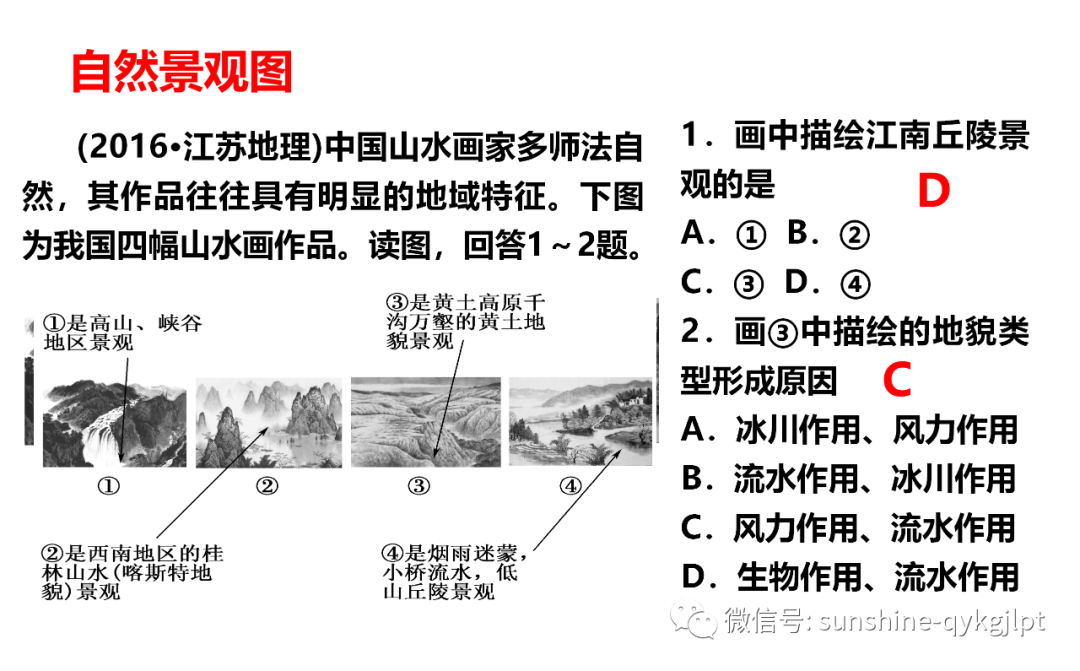 22.画中描绘江南丘陵景观的是( )A.① B.② C.③ D.④23.画③中描绘的地貌类型形成原因是( )A.冰川作用、风力作用 B.流水作用、冰川作用C.风力作用、流水作用 D.生物作用、流水作用【答案】22.D23.C【分析】试题分析:22.从图中可以①地形崎岖,相对高度很大,属于山区,②桂林山水,属于喀斯特地貌,③沟谷发育比较好的地形,属于我国的黄土高原,④地形有一定的起伏,但是相对高度不是很大,属于丘陵地形。江南丘陵属于低山丘陵地区。故选D。23.③沟谷发育比较好的地形,属于我国的黄土高原,黄土高原早期是风从西北地区吹来的尘埃沉积而形成的高原,后来主要是受到流水侵蚀作用形成的,所以C正确。考点:地表形态变化的内、外力因素(地质作用)