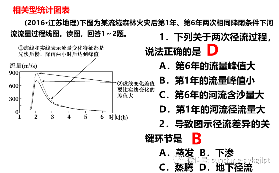 12.关于两次径流过程,说法正确的是( )A.第6年的流量峰值大B.第1年的流速峰值小C.第6年的河流含沙量大D.第1年的河流径流量大13.导致图示径流差异的关键环节是( )A.蒸发 B.下渗C.蒸腾 D.地下径流【答案】12.D13.B【分析】森林火灾后,地表植被覆盖率低,相同降雨条件下,下渗减少,地表径流增大。两次径流过程中第1年的河流径流量大。导致图示径流差异的关键环节是下渗。12.森林火灾后,地表植被覆盖率低,相同降雨条件下,下渗减少,地表径流增大。第1年没有植被涵养水源,地表径流增多,且流速加快,故流速峰值大,B错。第6年时,植被已经恢复很多,流量峰值较小,A错。植被恢复,第6年的河流含沙量小,C错。缺少植被阻挡,第1年的流速峰值大,D对。13.火灾后,植被覆盖率低,涵养水源能力弱,降水下渗的少,地表径流量大。导致图示径流差异的关键环节是下渗,B对。蒸发、蒸腾对地表径流影响小,C错。地下径流也受下渗环节影响,D错。