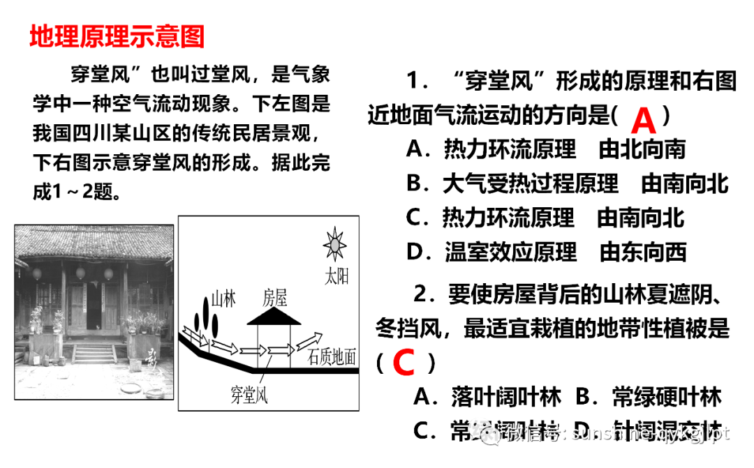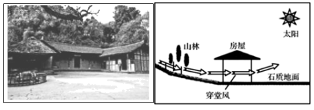 “穿堂风”也叫过堂风,是气象学中一种空气流动现象。下左图是我国四川某山区的传统民居景观,下右图示意穿堂风的形成。据此完成下面各题