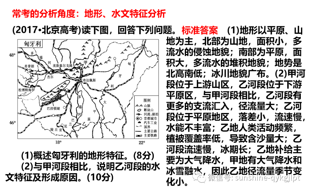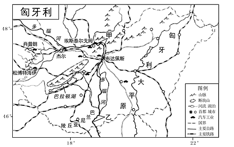 (1)概述匈牙利的地形特征。(2)简述巴拉顿湖形成的主要过程。(3)与甲河段相比,说明乙河段的水文特征及形成原因。匈牙利的汽车工业历史悠久,杰尔是全国重要的汽车工业城市,拥有多家与汽车工业相关的研发和教育机构。近年来,杰尔、肖普朗,埃斯泰尔戈姆和松博特海伊等城市吸引了诸多跨国汽车公司和零部件供应商投资建厂,80%以上的产品用于出口。(4)说明匈牙利汽车工业分布特点和原因。【答案】(1)以平原、丘陵为主;多瑙河以东主要为平原,北部和多瑙河以西多山地;地势总体北部、西部高,东南部低(2)断层发育,断裂下陷,积水成湖(3)流经平原地区,落差小,流速慢;有较多支流汇入,流量大;纬度较低,结冰期短(4)集中分布在匈牙利西北部。汽车工业基础好;劳动力素质高;汽车工业生产地域联系紧密;公路和铁路交通便利;主要面向国外消费市场【详解】(1)地形特点的描述主要包括:主要地形类型及其分布;地势的高低状况;主要地貌类型;沿海地区海岸线的曲直状况。据图可知,匈牙利境内大半范围为匈牙利大平原,中部为山脉和巴兰尼亚丘陵,所以地形以平原、丘陵为主;多瑙河以东为平原,北部和多瑙河以西多山地;根据多瑙河的流向,大致从西北向东南方向流,可知地势总体北部、西部高,东南低。(2)据图和图例可知,巴拉顿湖周边为断块山,所以该湖泊的形成应以内力作用角度分析,即地壳断裂下陷雨水汇集而成的湖泊。(3)河流的水位特征应从流速、流量、水位变化、含沙量、结冰期等方面分析。应结合所在区域地形和气候特征分析。据图可知,甲河段流经山区,落差大,河流流速快;流域面积小;流量小;且纬度高,结冰期较长;而乙河段流经平原,河流流速慢;流域面积大;支流多,汇水量大,流量大;且纬度低,结冰期短。(4)据图可知,匈牙利汽车工业主要分布在在匈牙利西北部的首都(布达佩斯)和城市(杰尔、肖普朗,埃斯泰尔戈姆和松博特海伊等)中。这些地区经济发达,汽车工业基础好,汽车工业生产地域联系紧密;劳动力素质高;公路和铁路交通便利;主要面向国外消费市场。