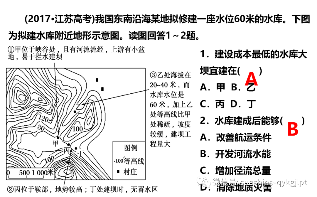4.建设成本最低的水库大坝宜建在A.甲 B.乙C.丙 D.丁5.水库建成后能够A.改善航运条件 B.开发河流水能C.增加径流总量 D.消除地质灾害【答案】4.A5.B【解析】4.水库大坝宜建在山谷口,同时库区要具有较大的集水区,根据图中等高线的分布规律可知,甲乙位于山谷地区,同时考虑到一座水位60米的水库,则乙地海拔低,建设成本高,所以选甲,故A项正确。5.水库建成后能够开发河流的水能资源,不会增加径流总量,可能引发地质灾害;该区域等高线密集,河流落差大不适宜航运,B项正确。故选B。