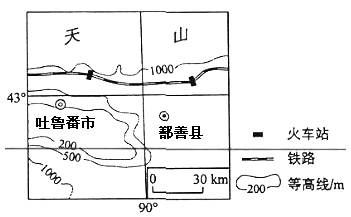 20世纪50年代,在外国专家的指导下,我国修建了兰新铁路。兰新铁路在新疆吐鲁番附近的线路如下图所示。读图,完成下列各题。