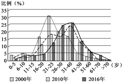 下图为“我国某城市不同年份各年龄段人口数量占比图”。读图完成下面小题。