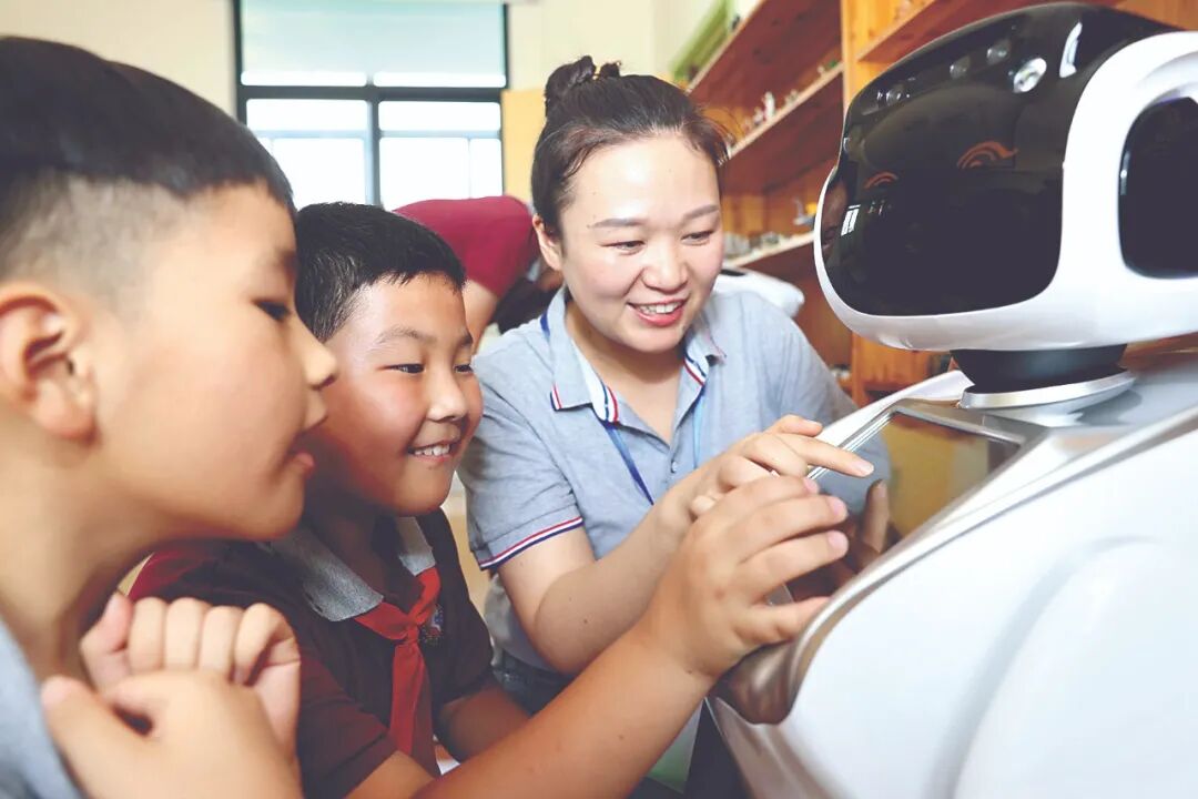 为缓解未成年人假期“看护难”问题,安徽省合肥市瑶海区试点免费提供音体美兴趣培养、公益看护、读书赏析、作业辅导、科技创新等为主要内容的“五彩假日”托管和教育服务。图为孩子们在和机器人做互动游戏。新华社发(解琛 摄)