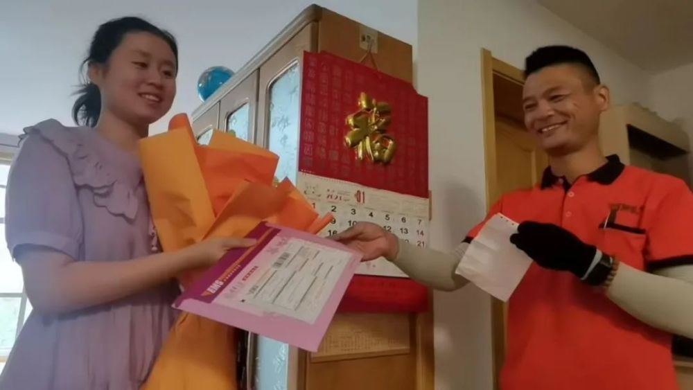 “恭喜,恭喜啊!”满面笑容的邮递员还送上了一束鲜花,表达了对兰心怡全家的真诚祝福。“谢谢!”接过鲜花和录取通知书后,兰心怡难掩笑容。