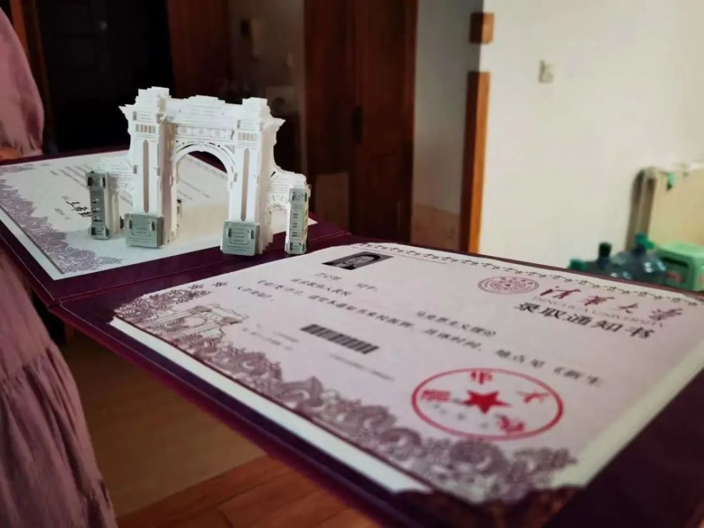 记者注意到,在拆封的过程中,兰心怡非常仔细。“这很珍贵,不敢弄坏了呀。”兰心怡笑着说。录取通知书一打开,里面夹着的校门纸雕工艺品很快立了起来。