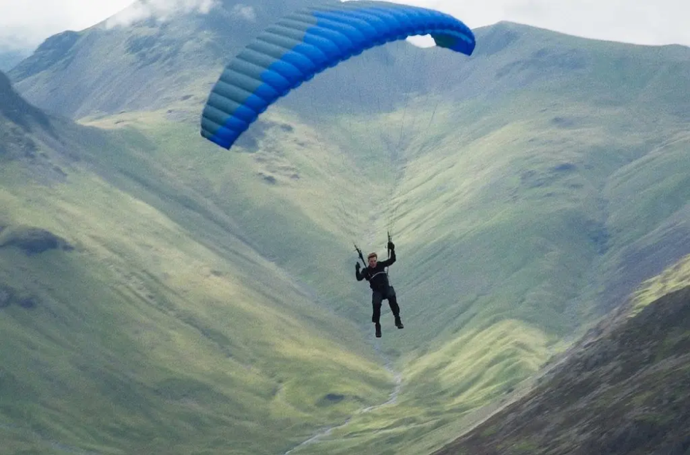 悬崖跳伞、车厢逃生等几组特技镜头,一开始也作为重要突破大力宣传,说是跳了几百遍,拍了6遍,摄像机恨不得怼到阿汤哥脸上,以证明是他亲自上阵,绝无替身和换脸。