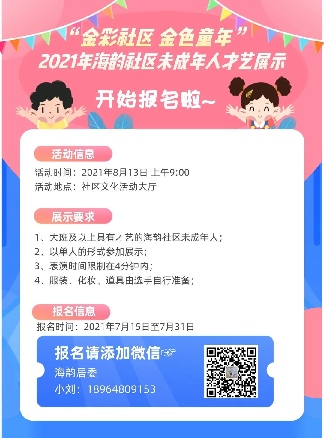 为展现未成年人朝气蓬勃、奋发进取的精神风貌,让小朋友们过一个“安全、健康、快乐、有益”的暑假,海韵社区于8月中旬开展了“金彩社区·金色童年”2021年未成年人才艺展示(线上)活动。