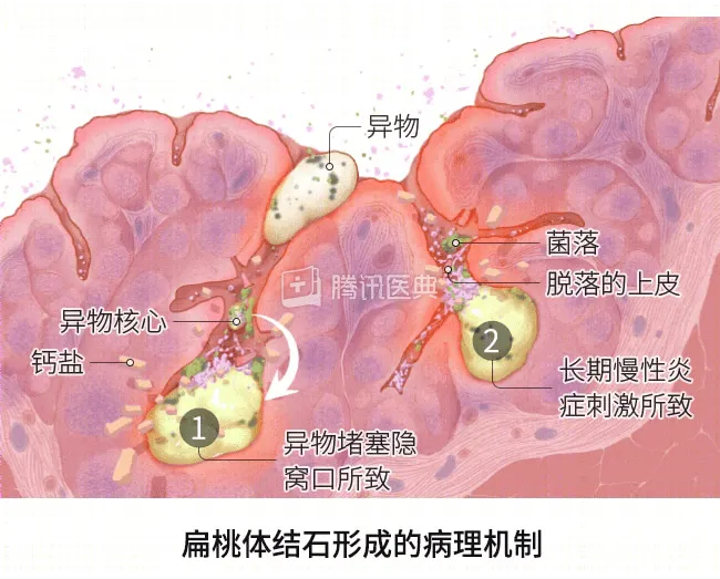 扁桃体反复出现慢性炎症,会使隐窝口变窄、堵塞,脱落的细胞碎片、菌团等更容易滞留,再和分泌物中的矿物质盐结合,形成干酪样的结石[5,6]。
