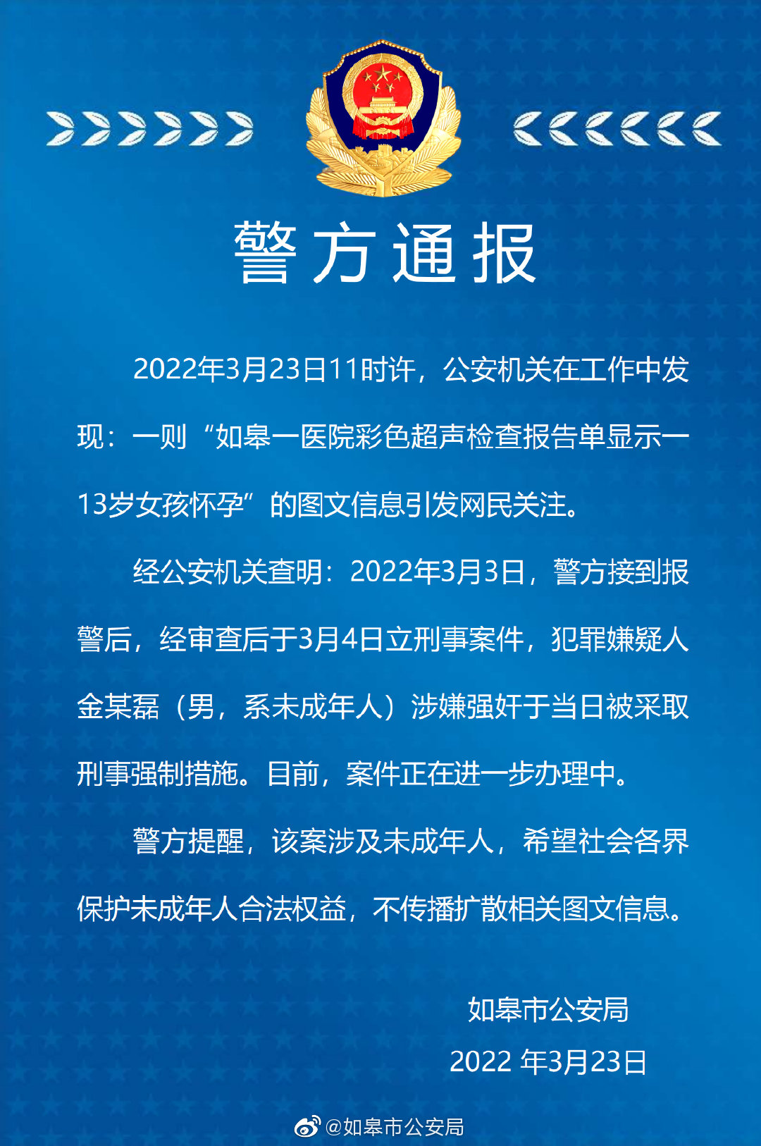 近期一则“如皋一医院彩色超声检查报告单显示一13岁女孩怀孕”的图文信息引发网民关注。 3月23日如皋市公安局发布通报,经公安机关查明:2022年3月3日,警方接到报警后,经审查后于3月4日立刑事案件,犯罪嫌疑人金某磊(男,系未成年人)涉嫌强奸于当日被采取刑事强制措施。 目前,案件正在进一步办理中。警方提醒,该案涉及未成年人,希望社会各界保护未成年人合法权益,不传播扩散相关图文信息。 据报道,事件的起因系江苏南通一名男子疑似炫耀13岁的女友怀孕了,并发了一张彩超图和报告单,“快来看我的崽!”(注:为保护未成年人合法权益,本文不转载相关图片信息),警方发现后将该男子抓获。 这条信息之所以引发舆论高度关注,是因为这起事件涉及对未成年人犯罪。为切实加强对未成年人的全面综合司法保护,及时有效惩治侵害未成年人违法犯罪,我国建立了侵害未成年人案件强制报告制度。 “13岁幼女怀孕”事件与2020年《北京儿童医院接诊三岁女童,医生检查完果断报警……》形成鲜明对比,“三岁女童因头部外伤入院,出现了头晕、呕吐、精神反应弱等症状,急诊科医生立刻采取了急救措施。 检查显示,女童左侧额颞顶枕颅板下出血,伴蛛网膜下腔出血。多位专家经过会诊,认为小孩可能遭受了家庭暴力,一致决定立刻报警。驻院民警接到报警后,案件被移送至门头沟公安分局办理。” 侵害未成年人案件强制报告,是指国家机关、法律法规授权行使公权力的各类组织及法律规定的公职人员,密切接触未成年人行业的各类组织及其从业人员,在工作中发现未成年人遭受或者疑似遭受不法侵害以及面临不法侵害危险的,应当立即向公安机关报案或举报。其中密切接触未成年人行业的各类组织中就包括医院、妇幼保健院、急救中心、诊所等医疗机构。 我国《未成年人保护法》明确规定,任何组织或者个人发现不利于未成年人身心健康或者侵犯未成年人合法权益的情形,都有权劝阻、制止或者向公安、民政、教育等有关部门提出检举、控告。国家机关、居民委员会、村民委员会、密切接触未成年人的单位及其工作人员,在工作中发现未成年人身心健康受到侵害、疑似受到侵害或者面临其他危险情形的,应当立即向公安、民政、教育等有关部门报告。 《关于依法惩治性侵害未成年人犯罪的意见》亦规定,对未成年人负有监护、教育、训练、救助、看护、医疗等特殊职责的人员以及其他公民和单位,发现未成年人受到性侵害的,有权利也有义务向公安机关、人民检察院、人民法院报案或者举报。 在工作中发现未成年人遭受或者疑似遭受不法侵害以及面临不法侵害危险的情况包括: 1. 未成年人的生殖器官或隐私部位遭受或疑似遭受非正常损伤的; 2. 不满十四周岁的女性未成年人遭受或疑似遭受性侵害、怀孕、流产的;十四周岁以上女性未成年人遭受或疑似遭受性侵害所致怀孕、流产的; 3. 未成年人身体存在多处损伤、严重营养不良、意识不清,存在或疑似存在受到家庭暴力、欺凌、虐待、殴打或者被人麻醉等情形的; 4. 未成年人因自杀、自残、工伤、中毒、被人麻醉、殴打等非正常原因导致伤残、死亡情形的; 5. 未成年人被遗弃或长期处于无人照料状态的; 6. 发现未成年人来源不明、失踪或者被拐卖、收买的; 7. 发现未成年人被组织乞讨的以及其他严重侵害未成年人身心健康的情形或未成年人正在面临不法侵害危险等情形。 据媒体报道,本案中的女孩才13岁,B超单上也是详细标注了年龄,因此符合 “不满十四周岁的女性未成年人遭受或疑似遭受性侵害、怀孕、流产的”的情形,产检医院和医务人员没有及时报警,显然未尽到法定的义务。 如果负有报告义务的单位及其工作人员未履行报告职责,造成严重后果的,由其主管行政机关或者本单位依法对直接负责的主管人员或者其他直接责任人员给予相应处分;构成犯罪的,依法追究刑事责任。同时,相关单位或者单位主管人员阻止工作人员报告的,予以从重处罚。 另外,关于强奸罪的规定,需要根据受害人的年龄给予不同程度的处罚。依据相关法律规定,对于不满十二周岁的被害人实施奸淫等性侵害行为的,应当认定行为人“明知”对方是幼女。 对于已满十二周岁不满十四周岁的被害人,从其身体发育状况、言谈举止、衣着特征、生活作息规律等观察可能是幼女,而实施奸淫等性侵害行为的,应当认定行为人“明知”对方是幼女。 已满十四周岁不满十六周岁的人偶尔与幼女发生性关系,情节轻微、未造成严重后果的,不认为是犯罪。 由此,即使13岁女孩自愿与对方发生关系,对方明知其未满14周岁的,也涉嫌构成强奸罪。 但是,如果嫌疑人未满十四周岁,犯故意杀人、故意伤害致人重伤或者死亡、强奸、抢劫、贩卖毒品、放火、爆炸、投放危险物质罪的,不负刑事责任。 强制报告制度作用的发挥,关键在于落实。 性侵害未成年人的案件严重侵害未成年被害人的身心健康,严重影响广大人民群众安全感,性质恶劣,危害严重。 医疗机构及其从业人员在收治遭受或疑似遭受人身、精神损害的未成年人时,应当保持高度警惕,按规定书写、记录和保存相关病历资料,固定证据,并依法履行强制报告义务,让犯罪分子受到应有的制裁。 来源 | 医法汇作者 | 医法汇团队爱爱医已获授权转载此文