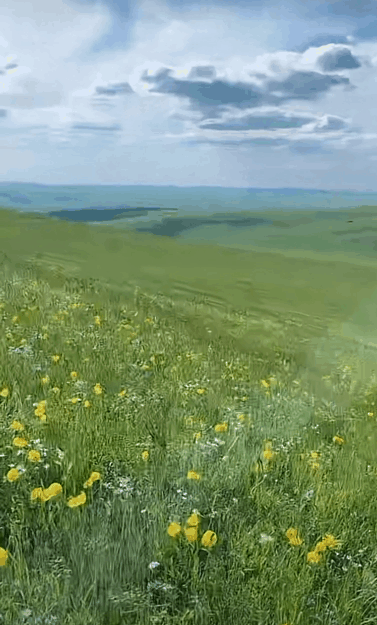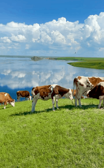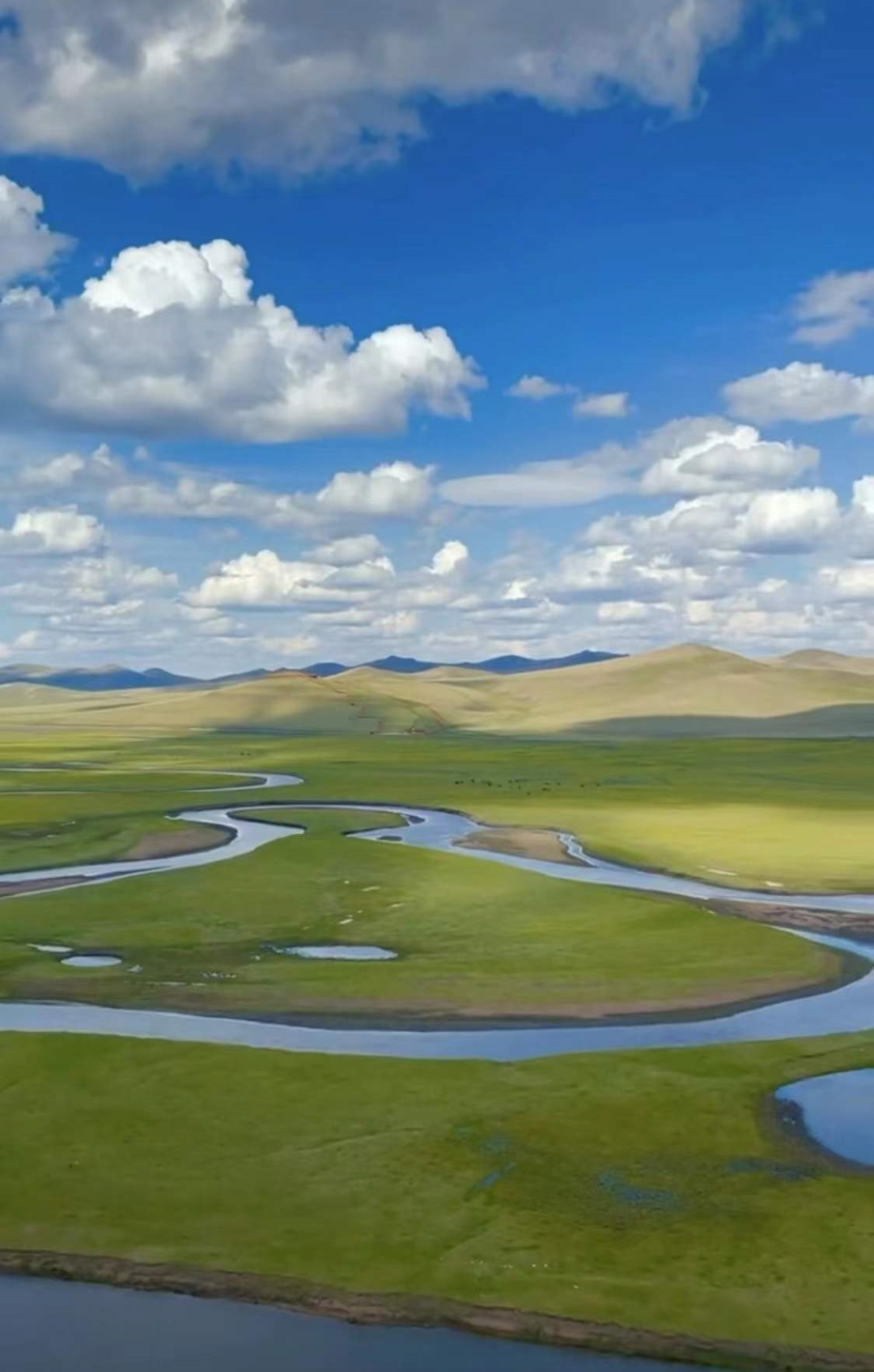 夏天,辽阔的草原在蓝天白云下,美得晃眼。