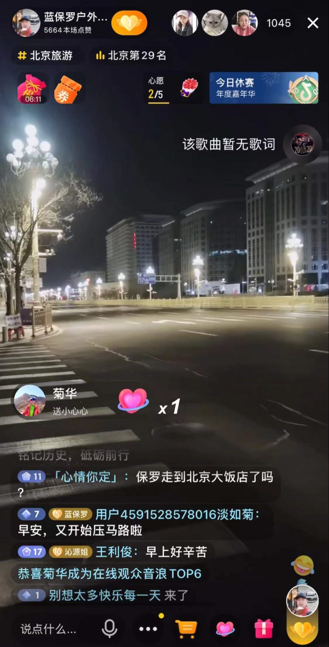 他5:20开播,从家里坐公交一路晃悠过去,和粉丝们一起,边看首都的清晨,边慢慢地聊天。