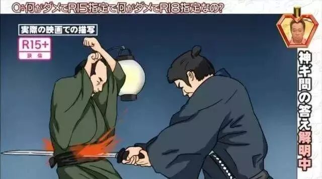 以日本电影《座头市》为例,影片中有一幕是名武士拿刀刺穿别人的画面,因此被划入了15禁。