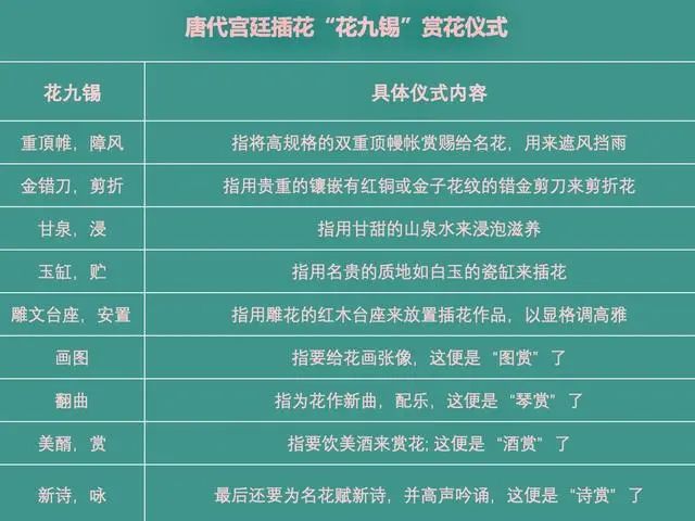 值得一提的是,当赏花从户外自然欣赏进入了艺术欣赏领域,相应的赏花礼仪也逐渐完善了起来。唐代罗虬的《花九锡》记录了唐代宫廷插花花九锡赏花仪式。认真品读,这套赏花仪式应该能够充分展示中华花文化精妙深邃的秘境,我们可以从中体会到古人赏花的仪式感。“花九锡”是宫廷赏花时赐予花卉的九种贵重的事物,具体如下表: