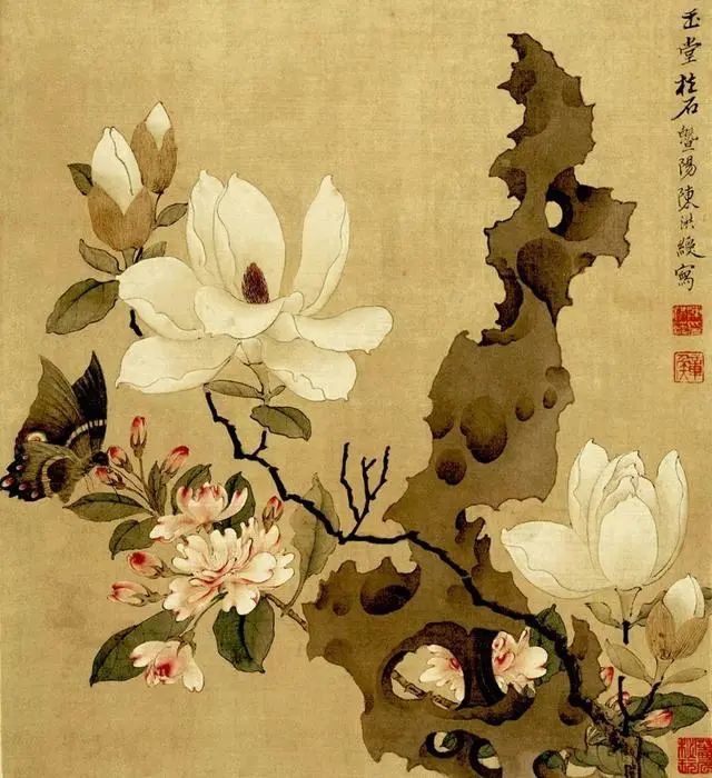 如明代陈洪绶 的《玉兰柱石图》,构图则非常疏朗,设色薄透清雅,用介乎写实与装饰的手法,以凝重的用笔、轻松的线条、简约概括的造型,来表现玉兰花端庄、隽永、清秀、淡雅的精神面貌。中国历代的文人雅士靠作画、咏诗,发扬传承了赏花文化。历史上分类记录各种花卉及其相关诗文的书籍相继问世。一部《广群芳谱》就是极富中国特色的中国古代“花卉大百科全书” 。国人对花卉的欣赏当然不止停留在这个层次。当花卉进入了艺术创作,赏花活动也从赏心悦目的感官愉悦进入到了一花一世界的审美意境。03