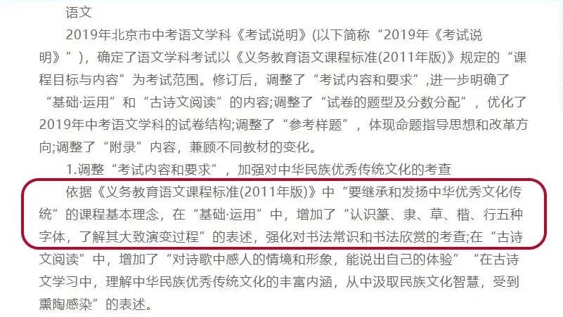 早在2019年的时候,北京市就对他们中考的《考试说明》进行了一些调整,突出对中华优秀传统文化和法治的考查,其中书法被纳入到语文学科中考查,增考认识篆、隶、草、楷、行五种字体。