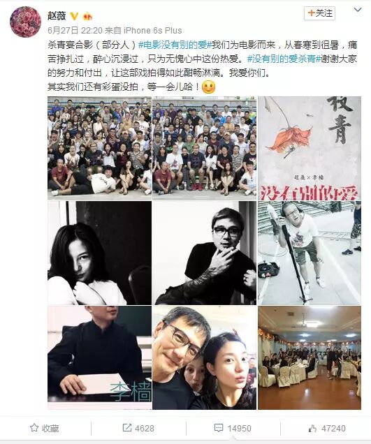 直到6月27日22时20分,@赵薇 就电影《没有别的爱》杀青发表微博,同时有意或无意的贴出了与戴立忍的合影: