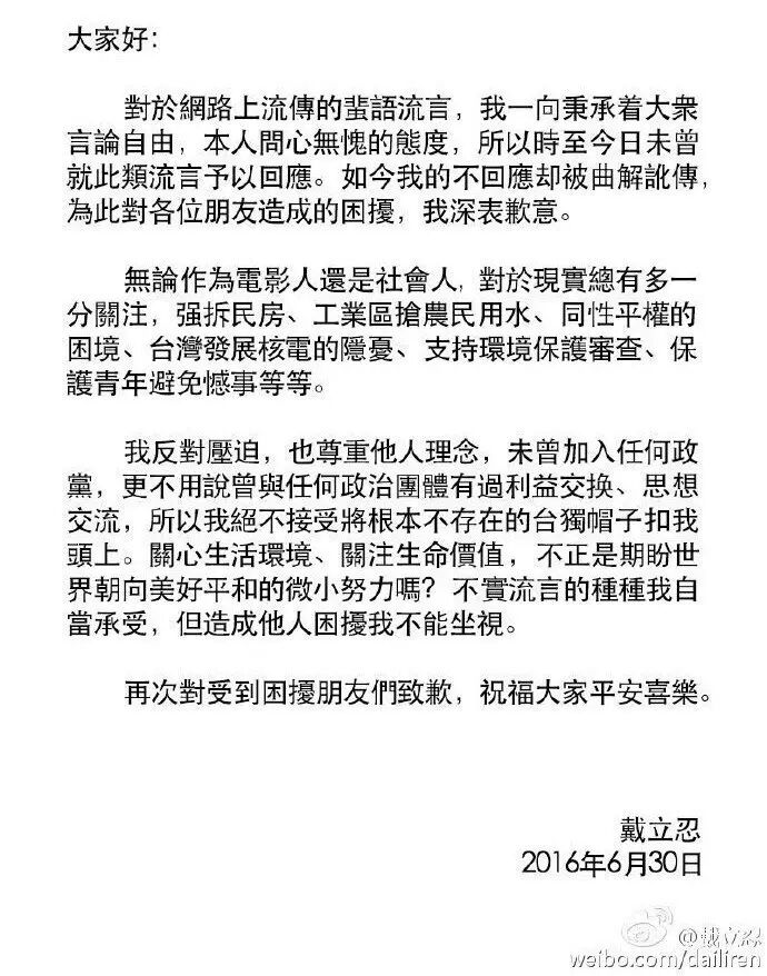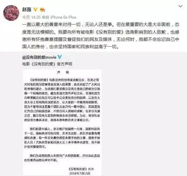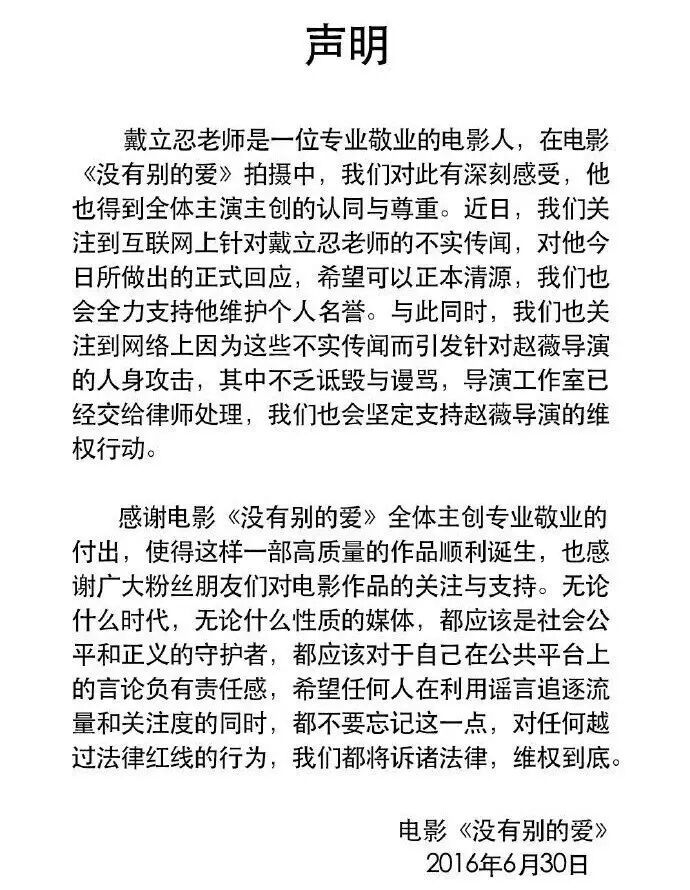 6月30日,戴立忍实名认证的新浪微博@戴立忍和电影《没有别的爱》官方微博@没有别的爱movie于20时56分和21时33分分别发表声明: