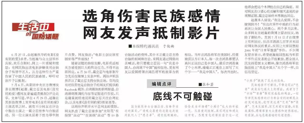 7月6日,共青团中央官方微博发表长微博《赵薇、戴立忍及电影〈没有别的爱〉遭网友普遍谴责抵制》评论此事,指出网友发声:“电影主创应该有国家尊严和底线!”中国国防报头版刊文述论“赵薇戴立忍事件”:
