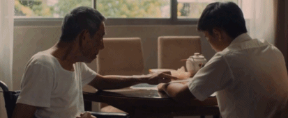 爱看武侠片的公公,居然动了(这是他在片中唯一的一次),用手在伟伦的手臂上教他写字。