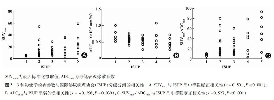 采用SPSS 25.0和GraphPad Prism 8软件处理数据。正态分布的计量资料采用±s表示,非正态分布的计量资料采用M(IQR)表示;计数资料采用频数(率)表示。连续变量组间比较采用独立样本t检验和秩和检验。不同参数与ISUP的相关性检验采用Spearman相关性分析。绘制受试者工作特征(receiver operating characteristic,ROC)曲线并通过曲线下面积(area under the curve,AUC)分析SUVmax、ADCmin和SUVmax/ADCmin对不同级别前列腺癌的诊断能力。以P<0.05为差异有统计学意义。