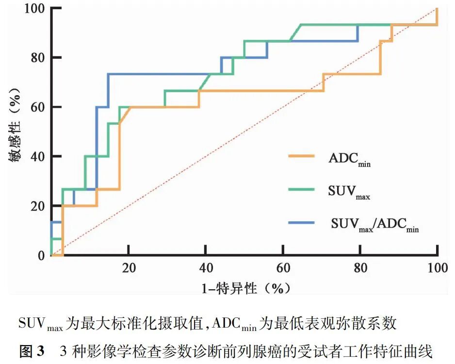 相关性分析结果显示,ADCmin与ISUP呈弱的负相关性(r=-0.296,P=0.039),SUVmax(r=0.501,P<0.001)和SUVmax/ADCmin(r=0.527,P<0.001)与ISUP呈正相关(图2)。ROC曲线见图3,SUVmax、ADCmin、SUVmax/ADCmin的AUC分别为0.731、0.615、0.749。以SUVmax/ADCmin比值37.23×103为界值,诊断前列腺癌的敏感性为73.3%,特异性为85.3%。
