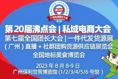 展会名称:第20届沸点会/私域电商大会/第七届全国团长大会/一件代发货源展/(广州)直播+社群团购货源供应链展览会/全国地标美食博览会