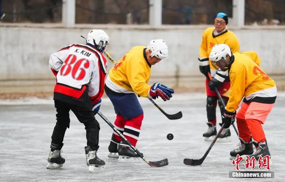 资料图:辽宁沈阳一公园内,一群爱好冰球运动的退休大爷组建冰球队进行比赛。